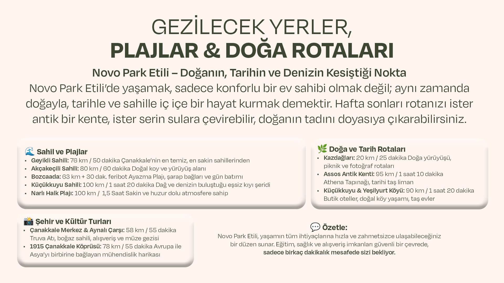 Novo Park Etili'de yaşamak, sadece konforlu bir ev sahibi olmak değil; aynı zamanda doğayla, tarihle ve sahille iç içe bir hayat kurmak demektir. Hafta sonları rotanızı ister antik bir kente, ister serin sulara çevirebilir, doğanın tadını doyasıya çıkarabilirsiniz.
