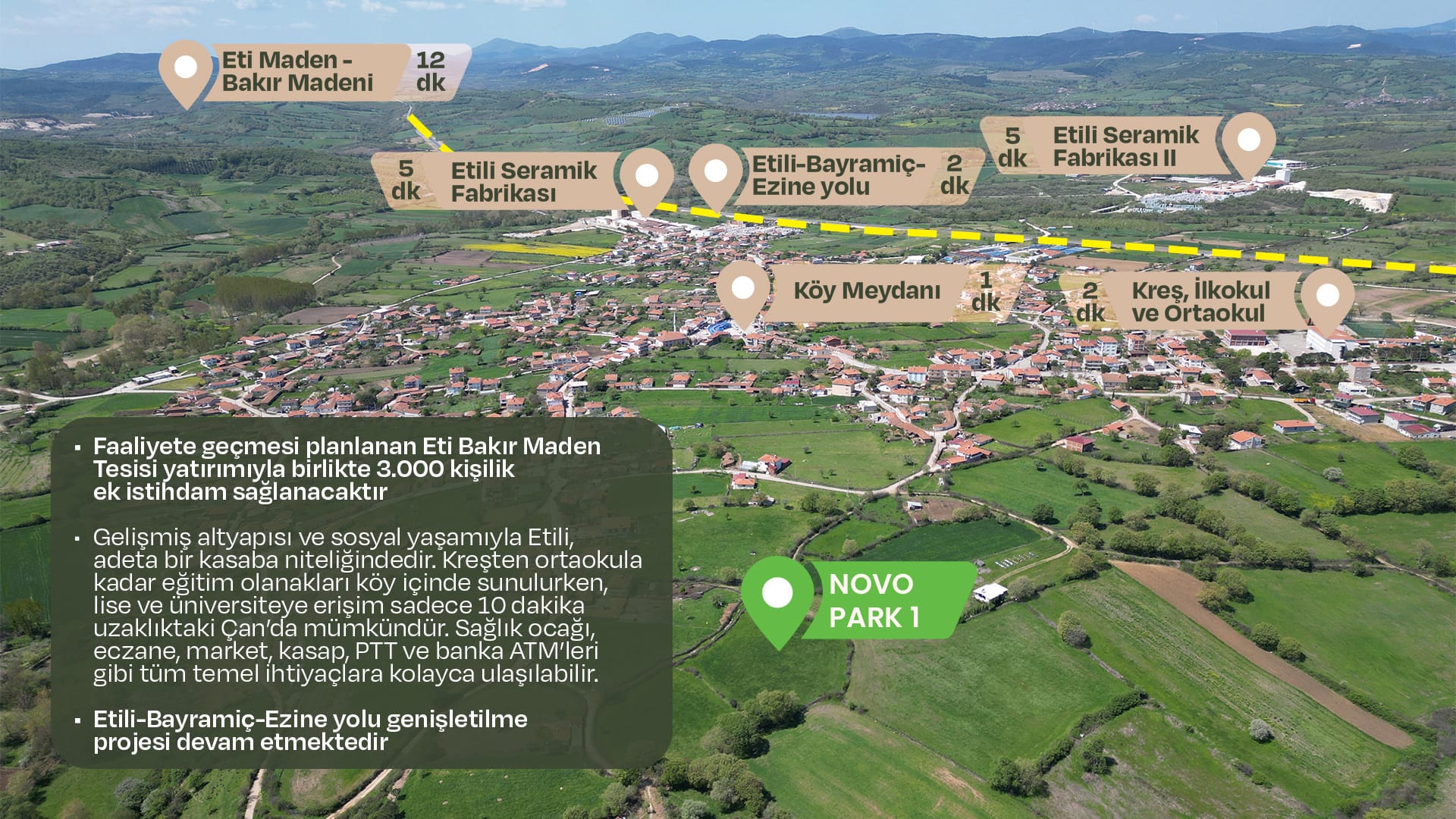 Novo Park Etili, yatay mimari ve taş dokusuyla tasarlanmış, düşük yoğunluklu butik bir yaşam projesidir. Bahçe katlarında daireye özel 15 m2 - 45 m2 arası bahçe kullanımı ile tüm daireler aynı planda, simetrik ve fonksiyoneldir. Bu yapılaşma sayesinde her daireye daha geniş açık alan, daha fazla nefes alma imkânı ve daha sakin bir yaşam ortamı sunulmaktadır.